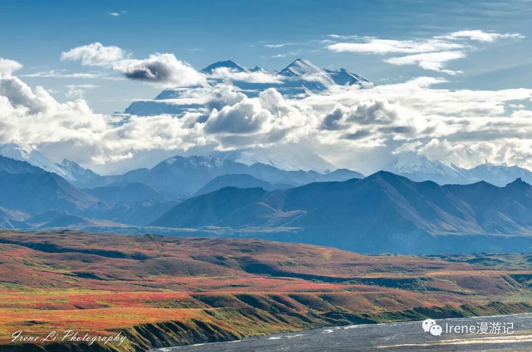 二进Denali 三下Wonder Lake,只为了在你的身旁留连,不忍离去。是的,你没有看错,那不是云端上的海市蜃楼,是拔地而起6190米的北美最高峰Denali。国家公园占地24,585平方公里,只有唯一的一条土路从东到西约150公里行程约6小时通达公园的最深处Wonder Lake,也是离Denali最近的地方,只有公园的巴士才能在这条路上行驶。沿途峰峦回转,峡谷河流,雪山冰川,森林灌木极地苔原渐次登场, 各种动物四处游荡, 美不胜收。