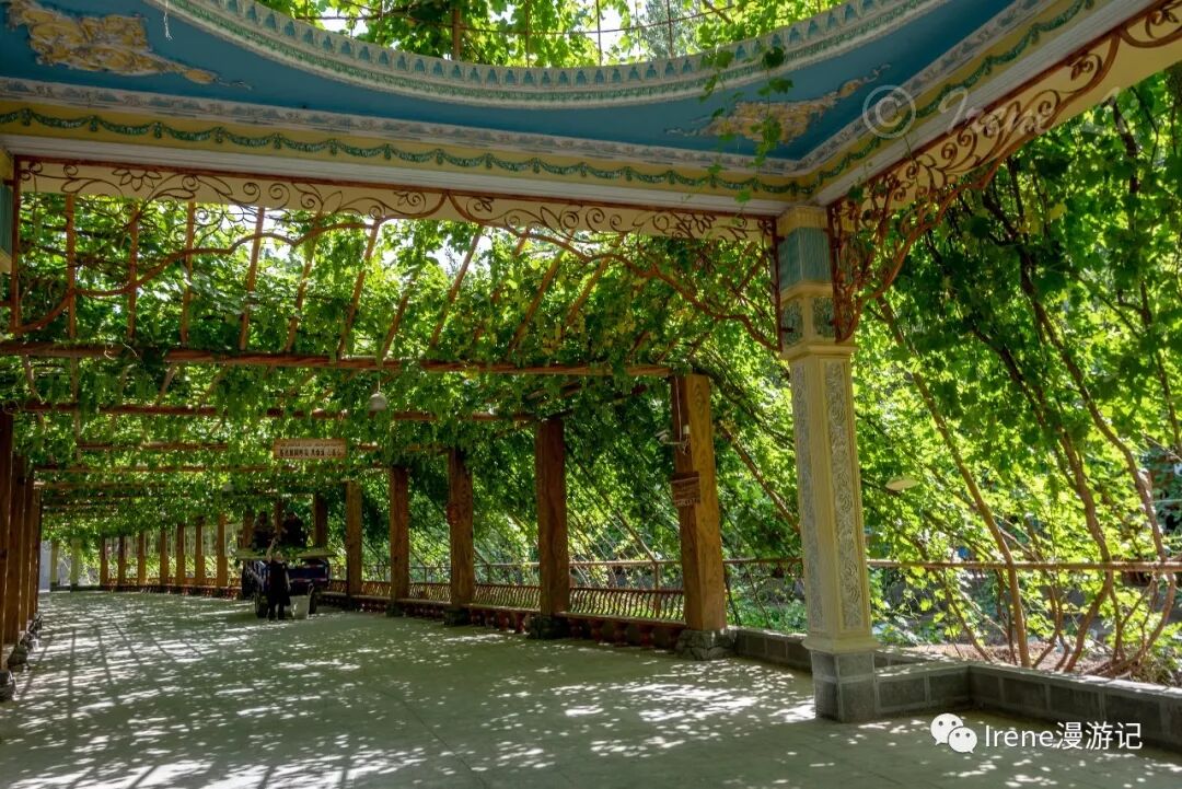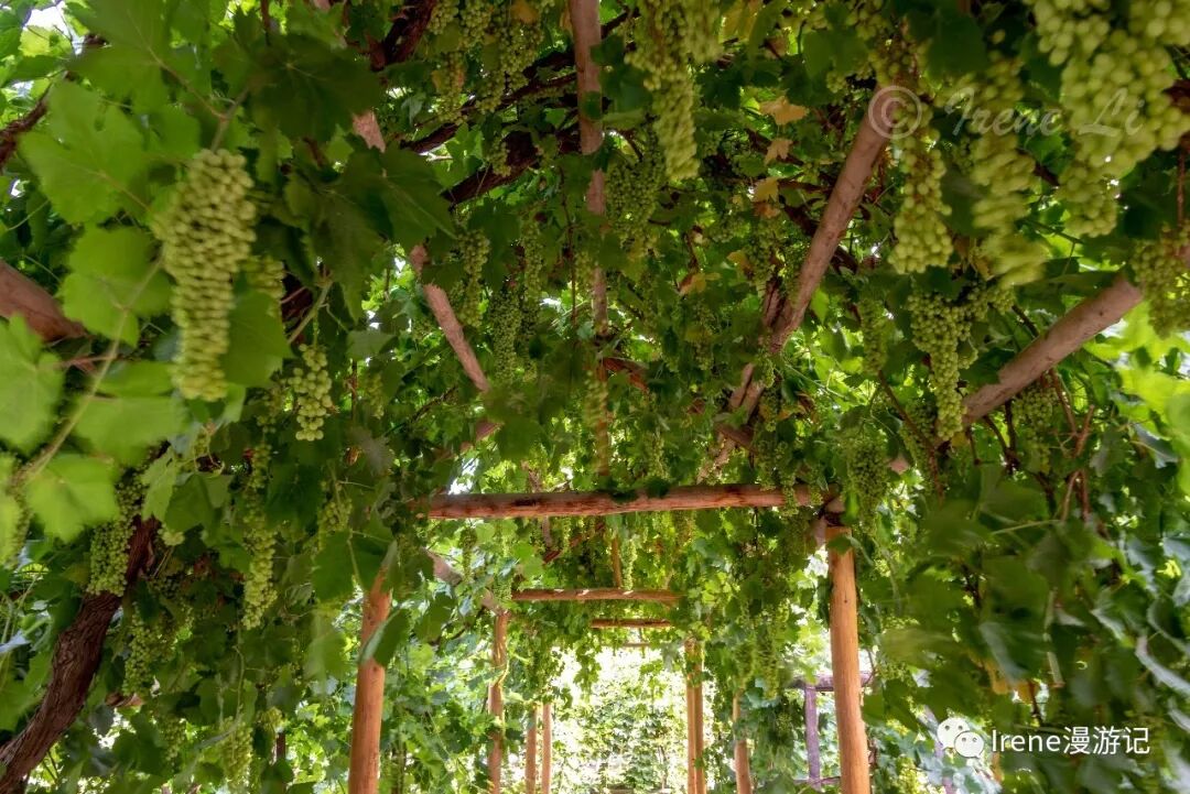 葡萄沟里又是另一番景象,周围大漠炎炎,沟内却是绿荫蔽日,流水潺潺,长达七公里的沟内葡萄架延延绵绵,由于特殊的气候条件和充足的日照,这里的葡萄糖份最足,品质最佳。在炎炎烈日之下,在葡萄架的浓阴里,成串的果实让人垂延欲滴,丰收在望,不过架上的要7、8月份才吃得上。